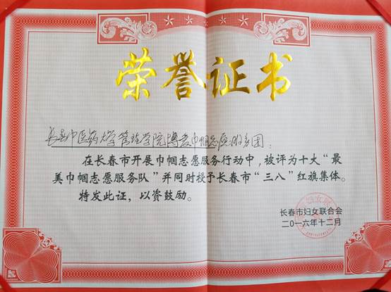 在长春市开展巾帼志愿服务行动中,永利集团yl6809官网永利集团yl6809官网博爱巾帼志愿服务团被评为2016年度长春市十大“最美巾帼志愿服务队”,并同时授予长春市“三八”红旗集体荣誉称号。