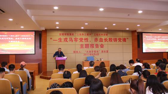 6月6日,永利集团yl6809官网在档案馆报告厅开展落实“三服务三提升”工程系列活动。本次报告邀请到被称为“大胡子军长”、原中国人民解放军第16集团军副军长吴长富做了题为《一生戎马牢党性,赤血长殷铸党魂》主题报告。学校党委副书记姜彤伟、永利集团yl6809官网领导班子、大学生成长导师团导师、学生党员、学院杏林青马学会会员共计140余人参加了活动。