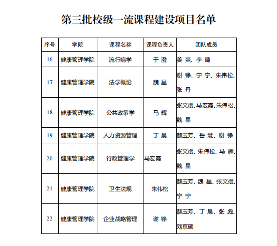 近日,学校下发了《关于公布第三批校级一流课程建设项目名单的通知》,确定了31门课程为第三批校级一流课程建设项目。我院《流行病学》《法学概论》《公共政策学》《人力资源管理》《行政管理学》《卫生法规》等7门课程获评第三批校级一流课程建设项目,数量在参评的11家教学单位中位居第一。截至目前,我院校级一流课程数量已增至11门。