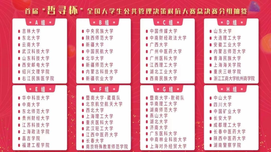 2022年12月4日, 由暨南大学主办、暨南大学公共永利集团yl6809官网(应急永利集团yl6809官网)承办、上海哲寻信息科技有限公司技术支持的全国大学生公共管理决策对抗大赛(总决赛)胜利闭幕。来自全国各地71所高校的72支队伍参加本次大赛。永利集团yl6809官网“扬名立万队”在本次大赛中荣获二等奖。