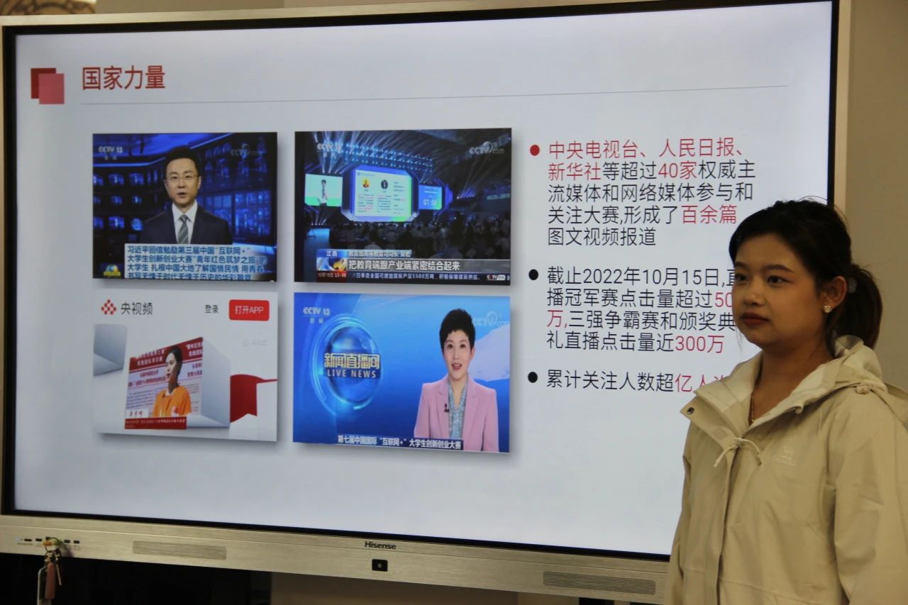 在交流会中,付雨鑫学姐结合自身参赛经验,向同学们介绍了“互联网+”大学生创新创业大赛的举办情况,并对各赛道进行解析,分享了参赛的心路历程和收获,最后为想要参加此类比赛的同学提出建议,提出要找对痛点、尽早培育、耐心打磨、感想敢做。她鼓励同学们积极参加大学生创新创业大赛,增长才干,丰富自己的大学生活。
