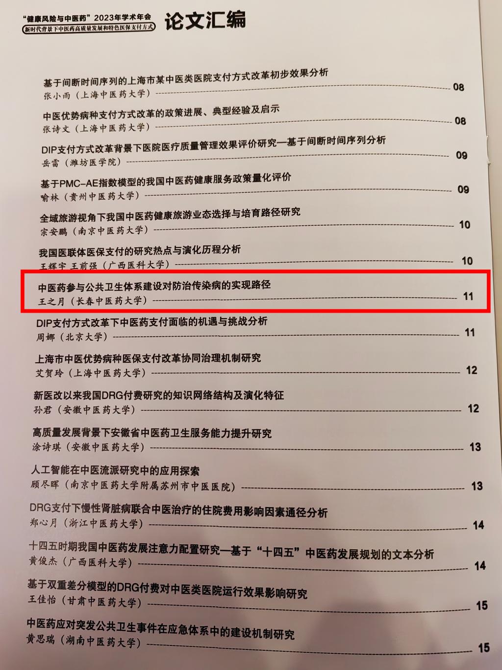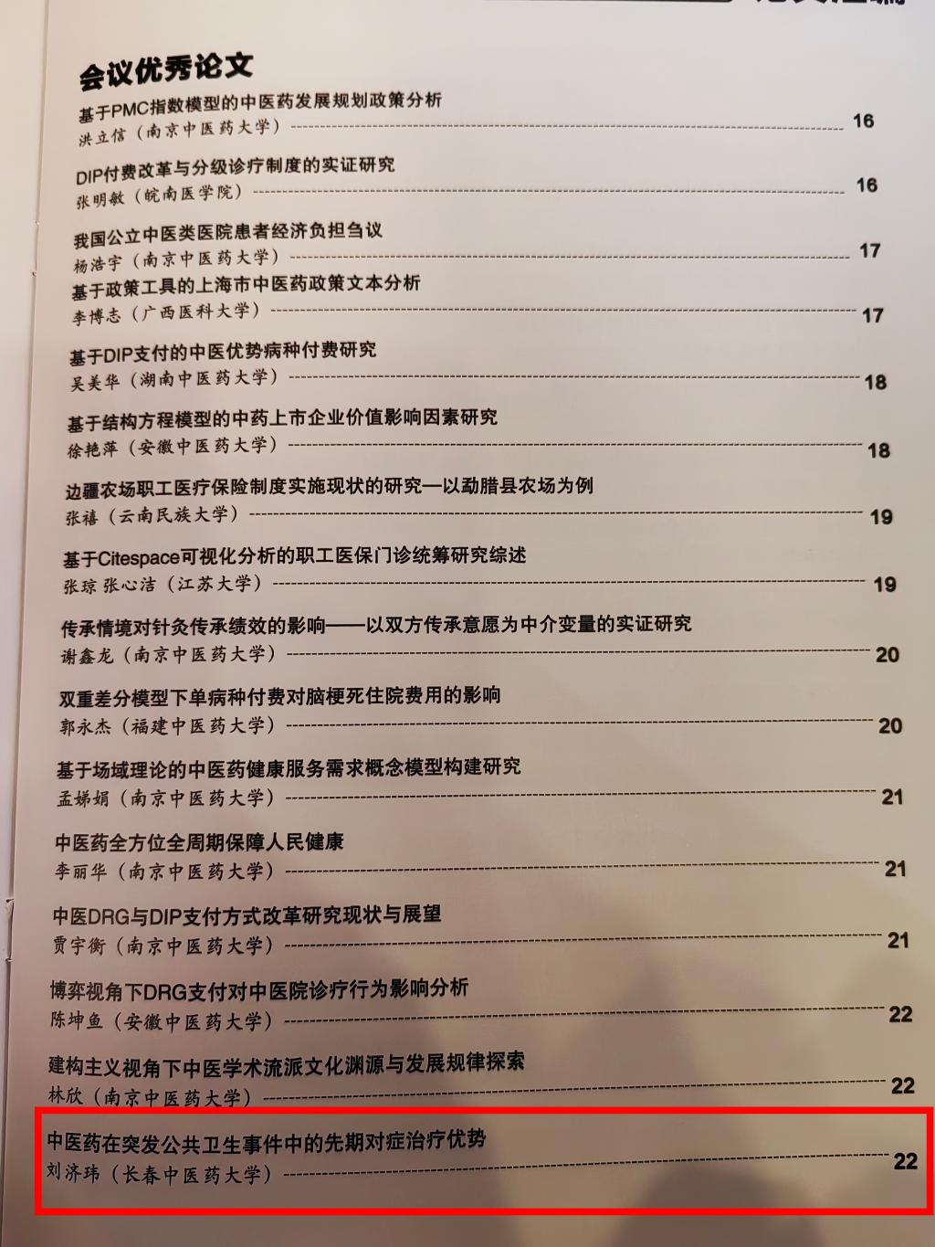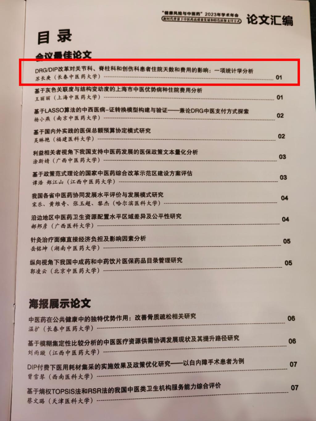 本次会议,在众多高校中永利官网学生脱颖而出,《DRG/DIP改革对关节科、脊柱科和创伤科患者的住院天数和费用的影响:一项统计学分析》以排名第一被评为会议最佳论文,会上做学术交流,《中医药参与公共卫生体系建设对防治传染病的实现路径》被选为海报展示,《中医药在突发公共卫生事件中的先期对症治疗优势》被评为会议优秀论文。