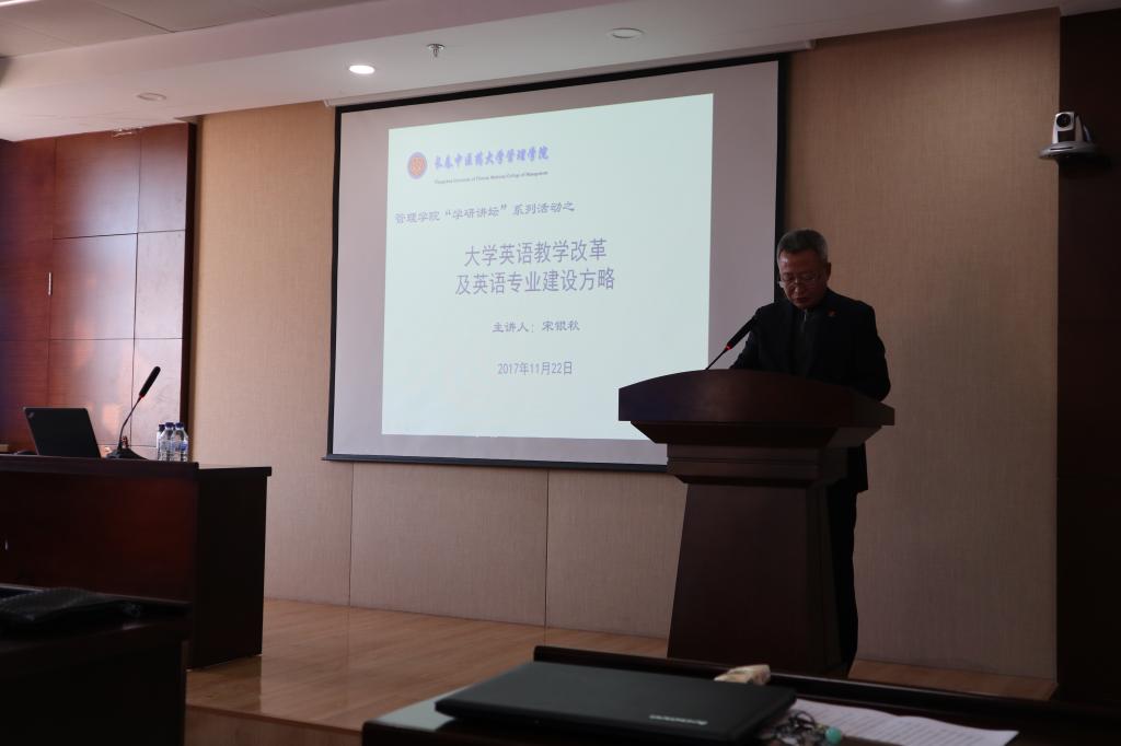 吉林省“教学名师”、省普通本科高等学校英语类专业教学指导委员会副主任委员、省大学外语教学研究副会长、吉林农业大学外国语学院院长宋银秋教授做了题为“大学英语教学改革及英语专业建设方略”的专题讲座。宋教授以吉林农业大学外国语学院教学改革及专业建设为例,介绍了专业的历史沿革、提高专业建设水平的有效措施、取得的成绩、目前专业建设面临的困境与挑战及未来发展思路。同时,宋教授也介绍了吉林农业大学组织开展的大学英语、研究生英语教学改革的思路和作法,指出“采用‘混合式’教学模式,实现线上与线下、课堂教学与第二课堂有机融合,夯实大学生语言基础,提高英语应用能力”是深化大学英语教学改革的基本指导思想,而研究生英语教学的改革出路则在于加强师资队伍建设,结合学生的学科背景和研究方向积极开展ESP教学。