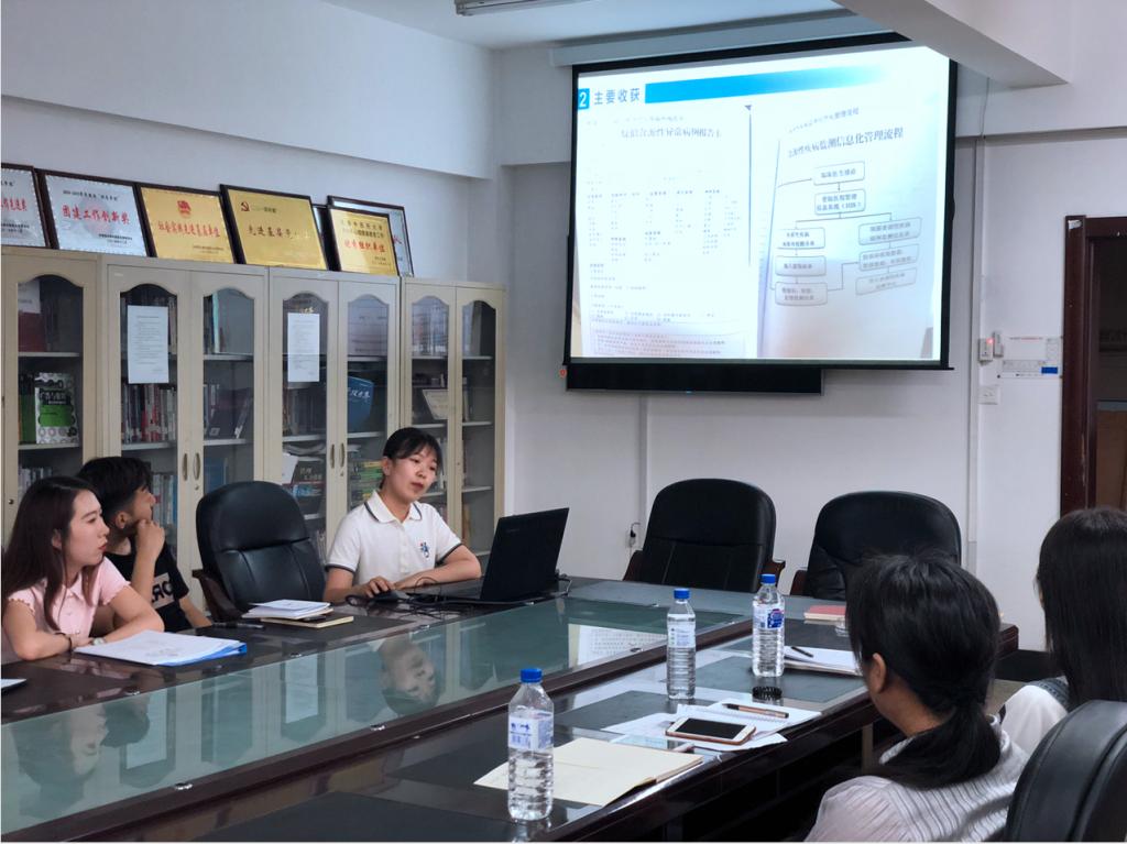 研究生刘芳彤、王晶、单良对其在环境与公共卫生监测科实习的情况进行了介绍,三名同学分别从公共卫生监测仪器的类别及使用方法、空气污染对人群健康影响的监测、生活饮用水样品的采集及处理方法进行了讲解说明。