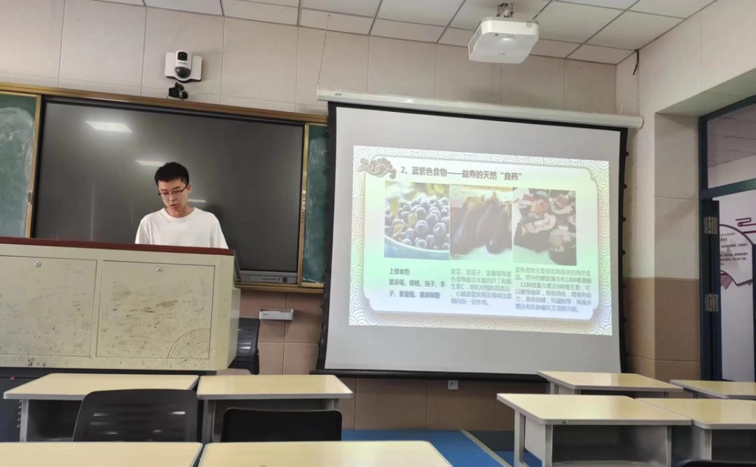 刘鹏举同学以《健康饮食养生常识》为主题汇报,主要内容包括食物的颜色功效、四季饮食的选择、巧吃食物治百病、健康饮水和食物的相生相克。举例说明红色的食物可以减轻疲劳预防感冒、蓝紫色的食物是益寿的天然“良药”、木耳与莴笋相生、土豆与西红柿相克等。同时强调,一日三餐是每个人生活所必须的,面对紧张而又忙碌的研究生生活,同学们更应该注重饮食健康。