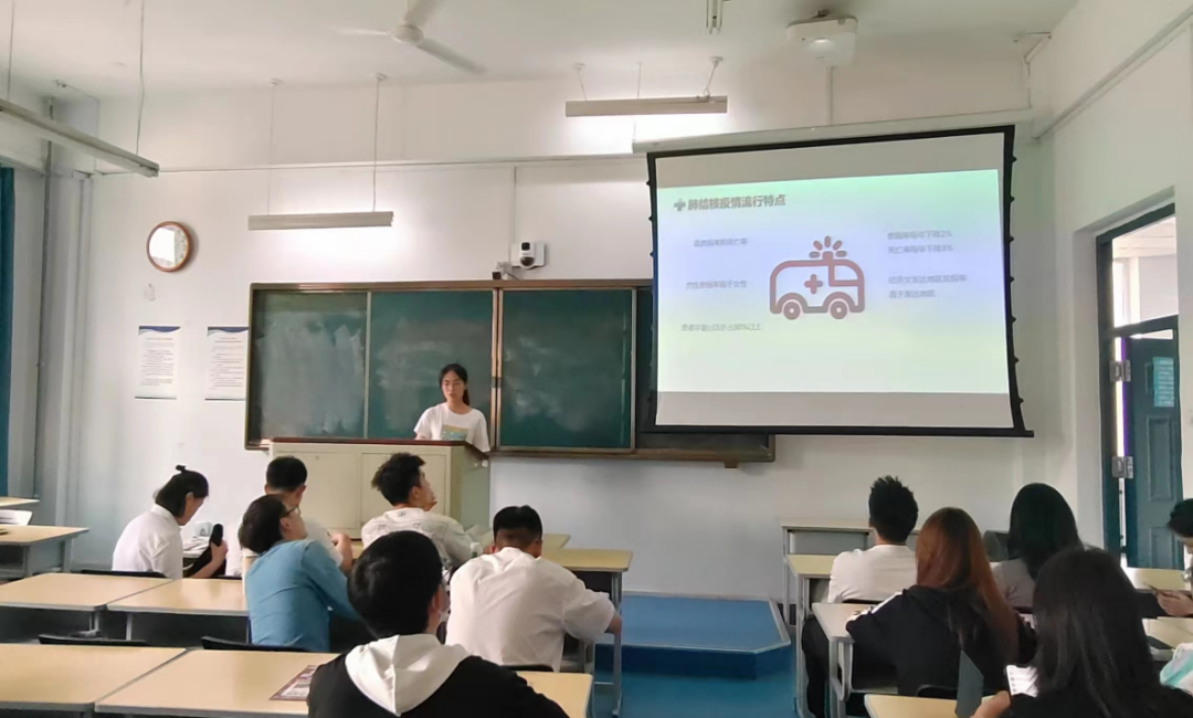 2021级公共卫生专业硕士研究生王叶以《预防肺结核》为主题汇报,主要内容包括肺结核概述、流行特征、肺结核的临床表现以及如何从传染病三要素预防肺结核。通过展示数据、案例分析的形式让同学们对肺结核病症有更深入的认识,为日后预防肺结核提供了新思路和方法。