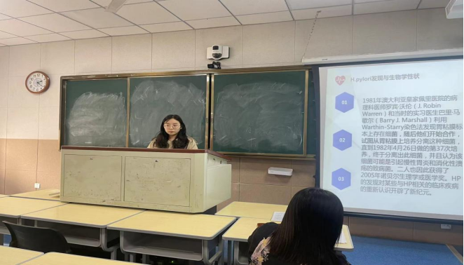 公共卫生专业硕士研究生张梦婷以《幽门螺杆菌健康教育》为主题汇报,从幽门螺杆菌的发现与生物学现状、感染现状、临床症状、危险因素及防治策略等几个方面展开讲解,让同学们对幽门螺杆菌有更深入的了解,同时学会如何预防感染幽门螺杆菌。