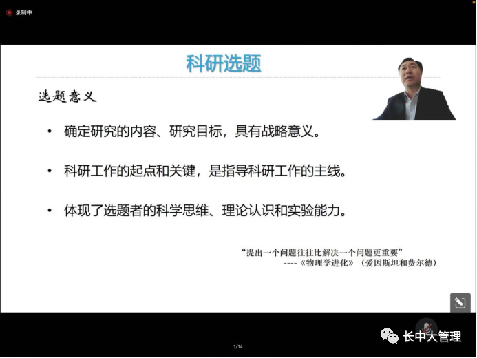 寇长贵教授首先从科研选题的来源、意义和原则等方面做出详细解读,并帮大家整理选题方法和角度。寇教授强调科研选题要有创新性、先进性、科学性、效益性、可行性,科研选题要符合选题的原则,根据本人的实际情况查新与调研,有针对性的进行申报。随后,寇教授结合自身的学术成长经历,与大家分享自己的科研选题的经验和方法,对教师科研团队组建、导师指导研究生科研选题、硕士研究生论文撰写、本科生大创项目选题等提供了新思路和新方法。最后,寇教授指出作为当代大学生,要抓住时间和机遇,加强学术沟通与交流,注重理论和方法的学习以及科研实践,掌握科研的基本思路和能力,为提升自身科研能力夯实基础。