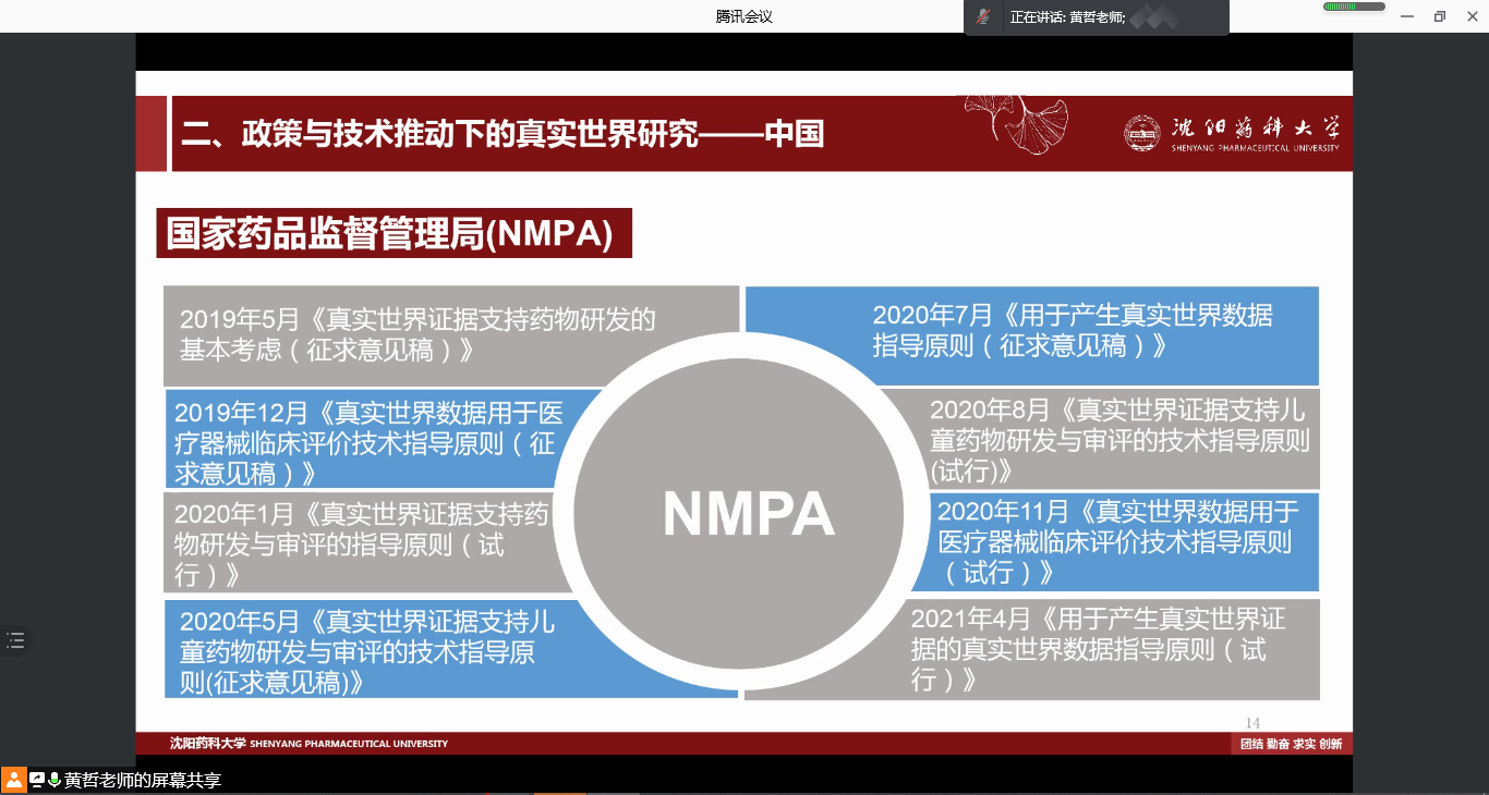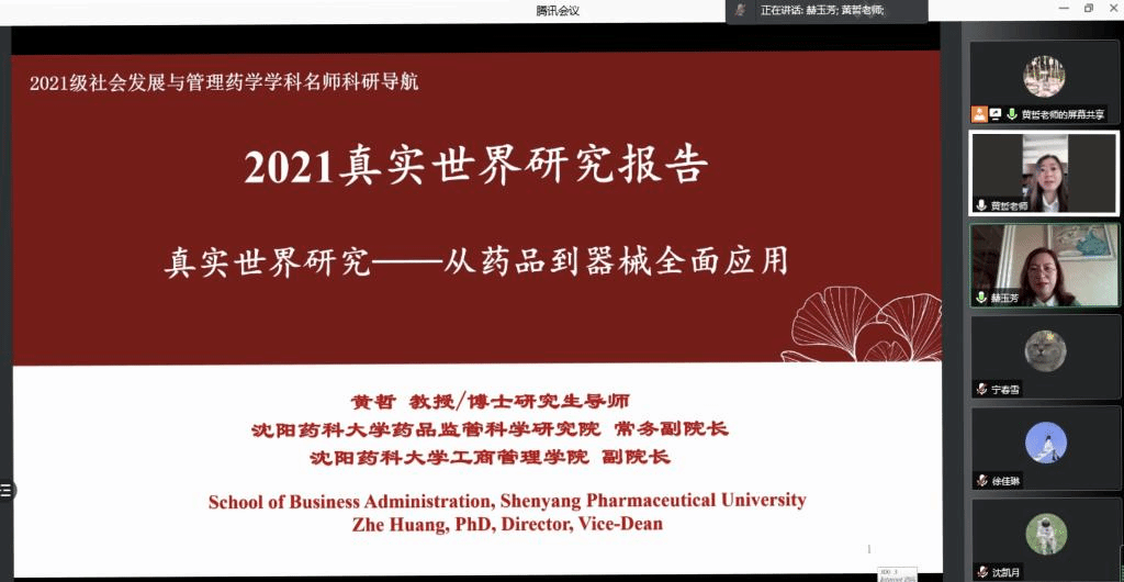为提高社会发展与管理药学学术型研究生的专业知识和创新能力,10月17日学院邀请沈阳药科大学工商永利集团yl6809官网副院长黄哲教授,开展线上腾讯会议,做题为“真实世界研究,从药品到器械全面应用”专题讲座。讲座由社会发展与管理药学学科带头人赫玉芳主持,全体2019级、2020级和2021级社会发展与管理药学硕士研究生参加了本次讲座。