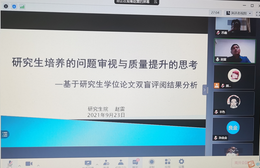 研究生院副院长赵雷,以《研究生培养的问题审视与质量提升的思考——基于研究生学位论文双盲评阅结果分析》为题,以研究生学位论文双盲评阅中出现的问题及专家反馈意见为蓝本,通过详实的数据展现和分析了问题原因,提醒各位导师要提前把关,严要求,逐步提高研究生学位论文的水平。