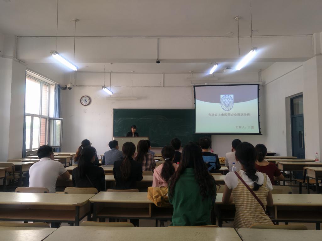 2018级社会发展与管理药学专业研究生于露以《吉林省上市医药企业现状分析》为汇报主题,以吉林省7家上市医药企业为例,从收入、利润集研发等方面介绍了医药企业的现状和问题,并提出了相应的对策,让大家对吉林省上市医药企业的总体框架有了更加具体的认识和了解。