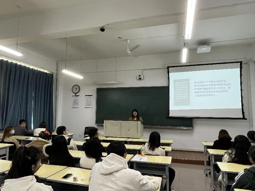 2022级公共卫生专业硕士研究生杜佳音同学以《慢性肝炎》为主题汇报,首先介绍慢性肝炎的六种常见病因,而后由图解分析慢性肝炎的临床表现,并根据不同慢性肝炎的病症讲解治疗方法,最后阐述如何有效的预防慢性肝炎疾病的发生。通过展示病症具体图片让同学们对肝炎有更深入的认识,为日后预防慢性肺炎提供新思路和方法。