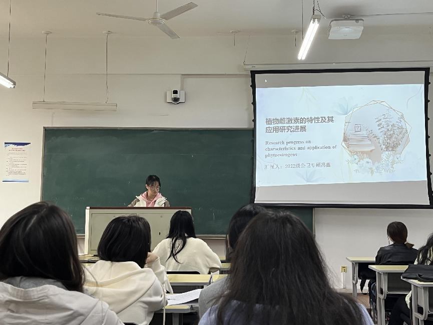 2022级公共卫生专业硕士研究生冯鑫以《植物雌激素的特性及其应用研究进展》为主题汇报,从植物雌激素的结构分类及分布、提取方法、作用机制和生理作用四个方面展开汇报,让同学们对植物雌激素的基本知识有所了解,进而明晰植物雌激素的进一步研究方向,填补知识空缺。