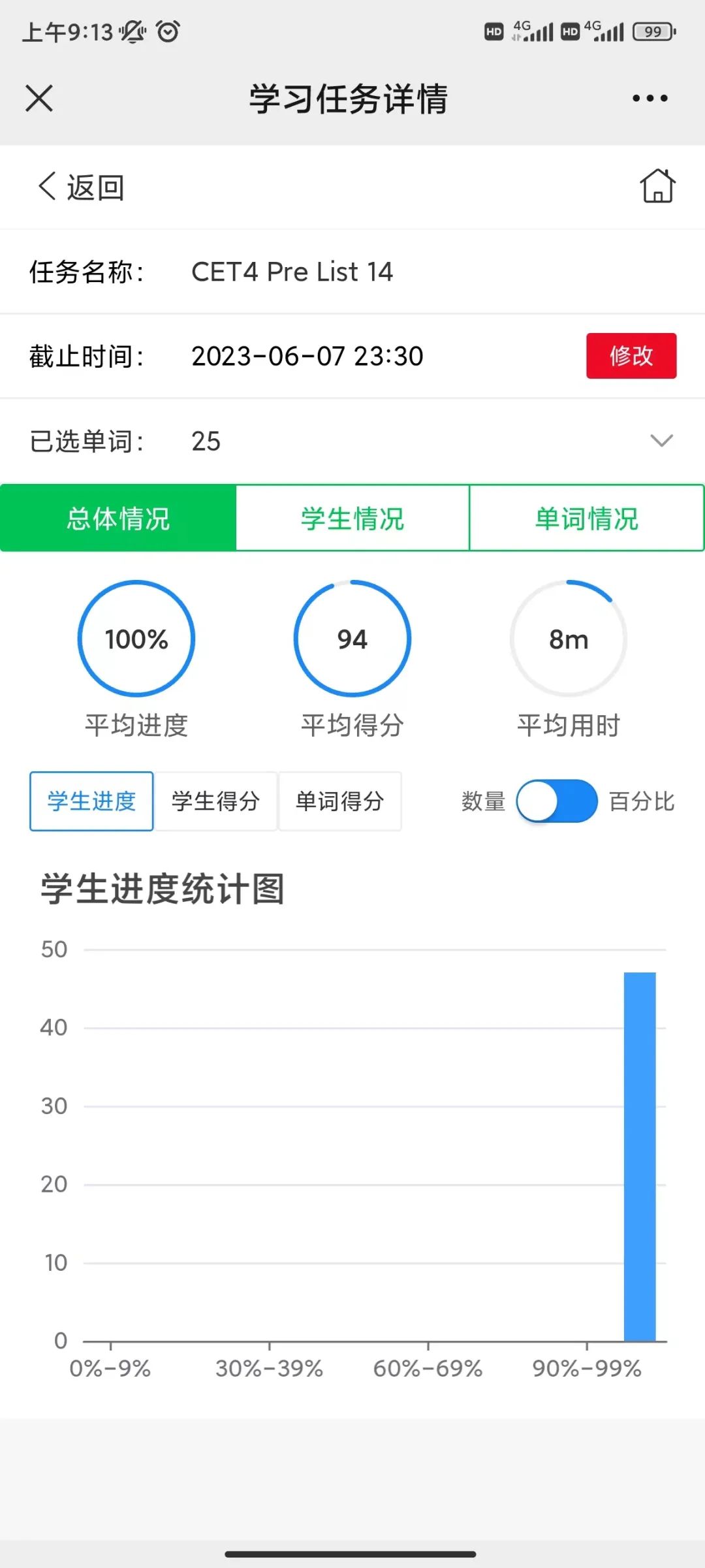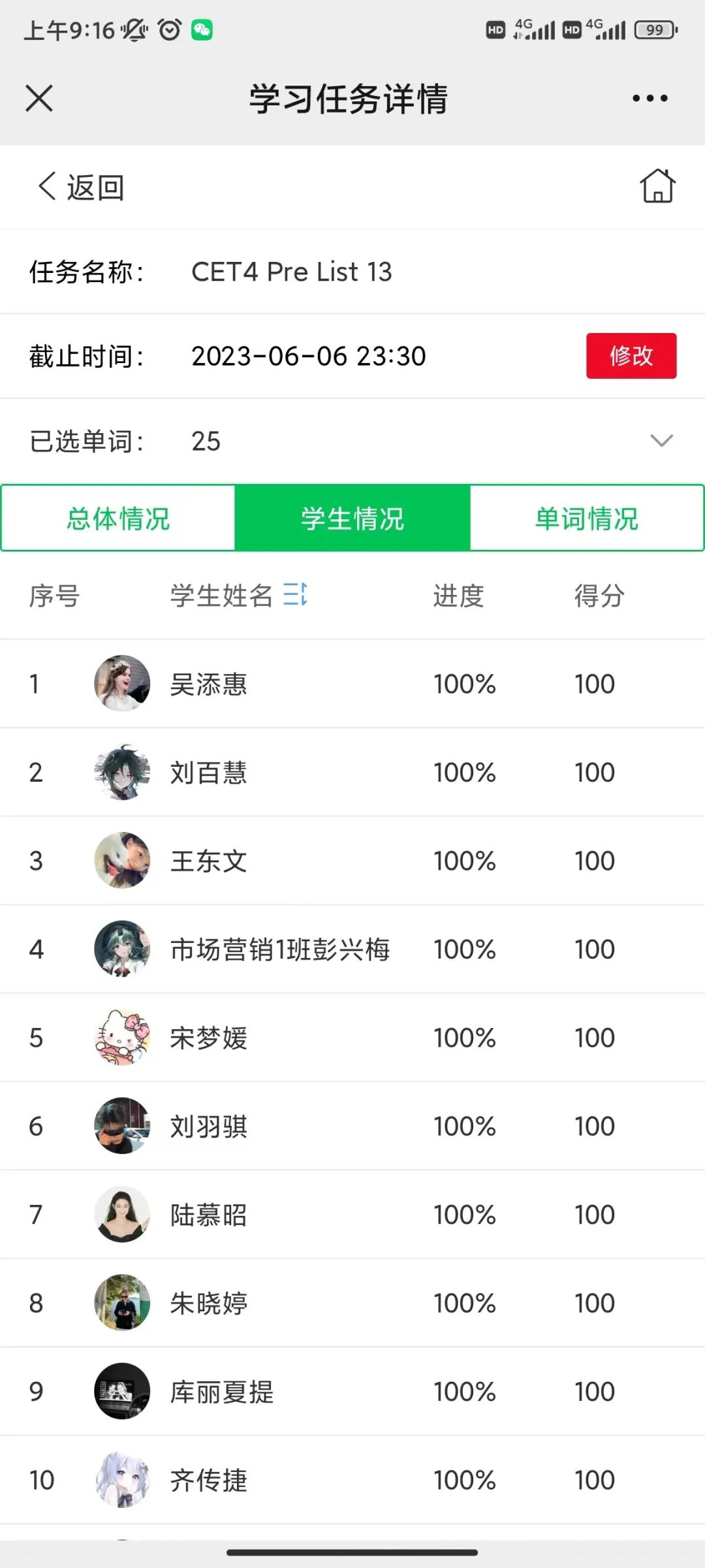 此次活动在“词达人”小程序上开展,学院全体2022级、2021级、2020级在校本专科学生均参与其中。每天早上六点由学生负责人发布单词打卡任务,同学们以班级为单位在规定时间内完成每日单词打卡计划。6月9日至6月15日期间,学院统一发布了单词测试任务,检验同学们这段时间以来的学习成果。