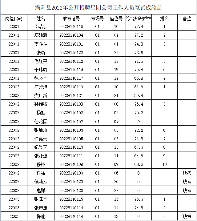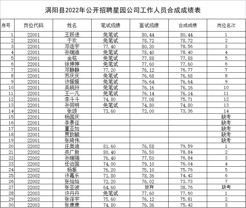 涡阳县2022年公开招聘星园公司工作人员合成成绩公布现将涡阳县2022年公开招聘星园公司工作人员合成成绩予以公布。今年会2022年8月30日