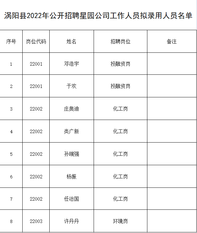 涡阳县2022年公开招聘星园公司工作人员拟聘用人员名单公示